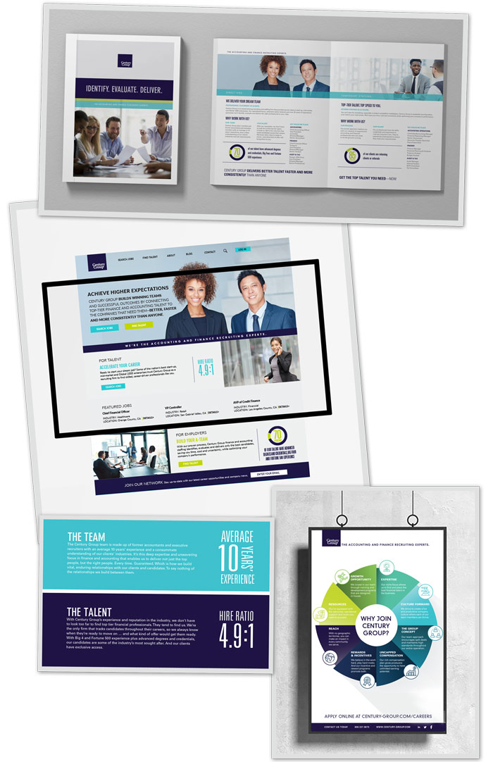 CENTURY GROUPTHE NEEDCentury Group, a staffing and recruitment firm that specializes in accounting and finance asked me to help carry the brand strategy into ongoing marketing materials. THE DESIGN PROCESSMultiple branding and collateral assignments; website study of improving current overall site architecture and navigation of company’s website and employer brand enhancement. |